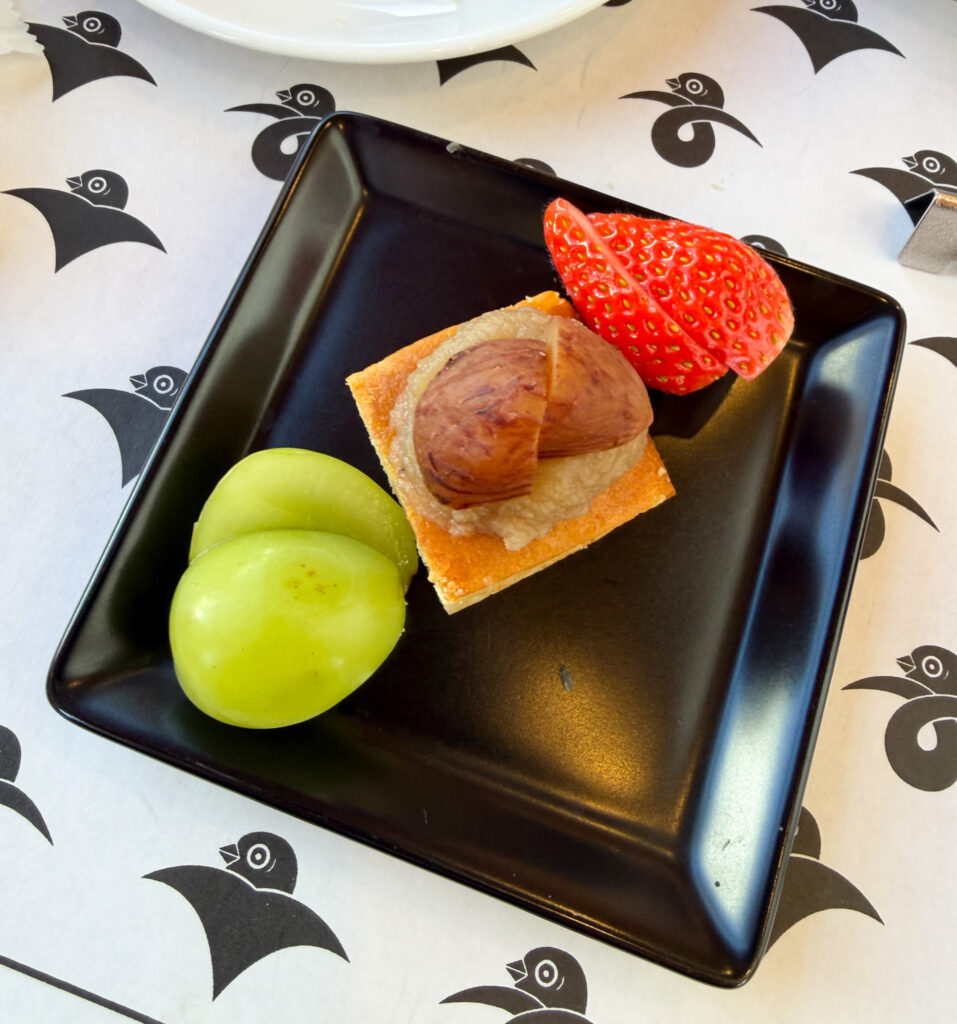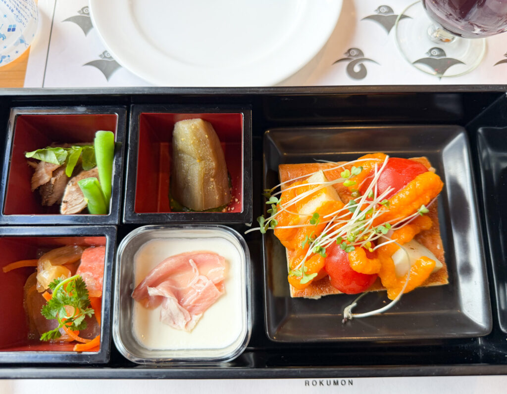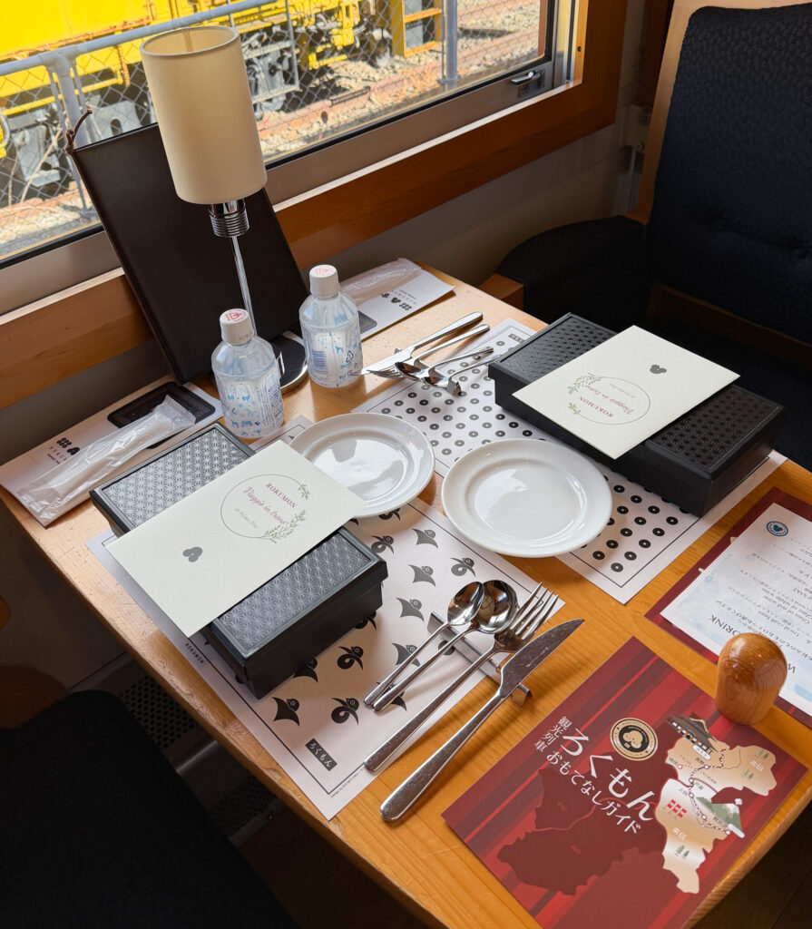 軽井沢出発の食事は洋食コース、長野出発のほうは和食コースです。洋食コースを選んだので、新幹線で軽井沢駅へ行き、しなの鉄道に向かいました。ろくもん専用の待合室でコーヒー又はりんごジュースを飲みながら出発を待ちます。出発の合図のほら貝が吹かれ、予約した席に案内されました。席には既に前菜が置かれており、この日のために朝ごはんを控えてきたので気持ちが上がりました。
