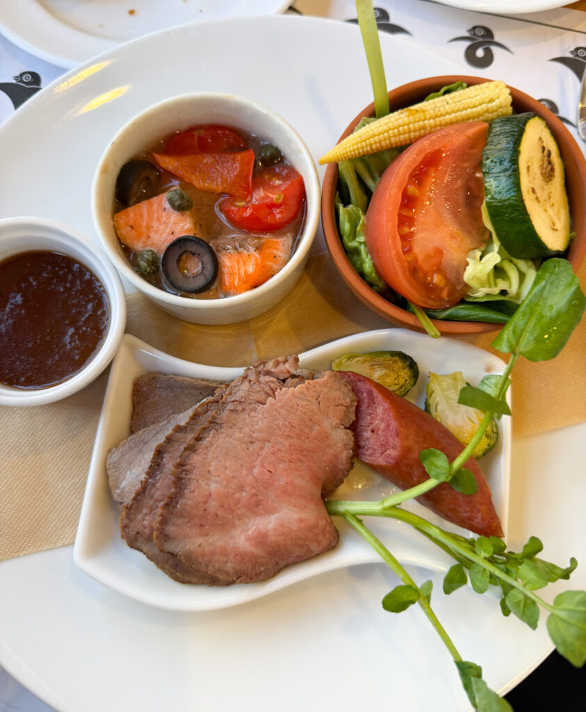 食べながら客室乗務員さんが説明してくれる車窓の見どころを聞き、窓の外を眺め、パンと温かいスープを食べたら、メインディッシュの登場です。