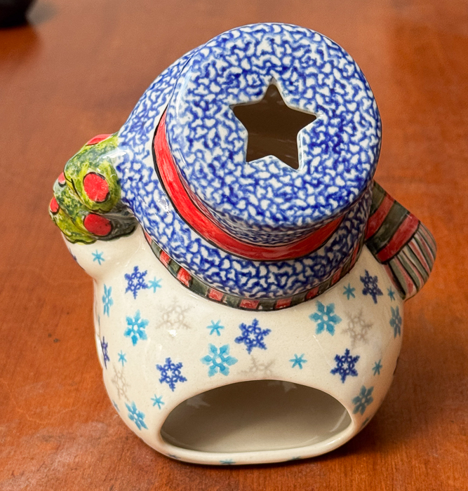 後ろから火をつけたティーキャンドルを入れると、星形に切り取られた隙間から光がこぼれます。微笑んでいる楽しげな表情に、ころころした後ろ姿もユーモラスな雰囲気です。火のついた蝋燭を入れておくと帽子の部分が熱くなるので、移動や火を消す時には気を付けてくださいね。