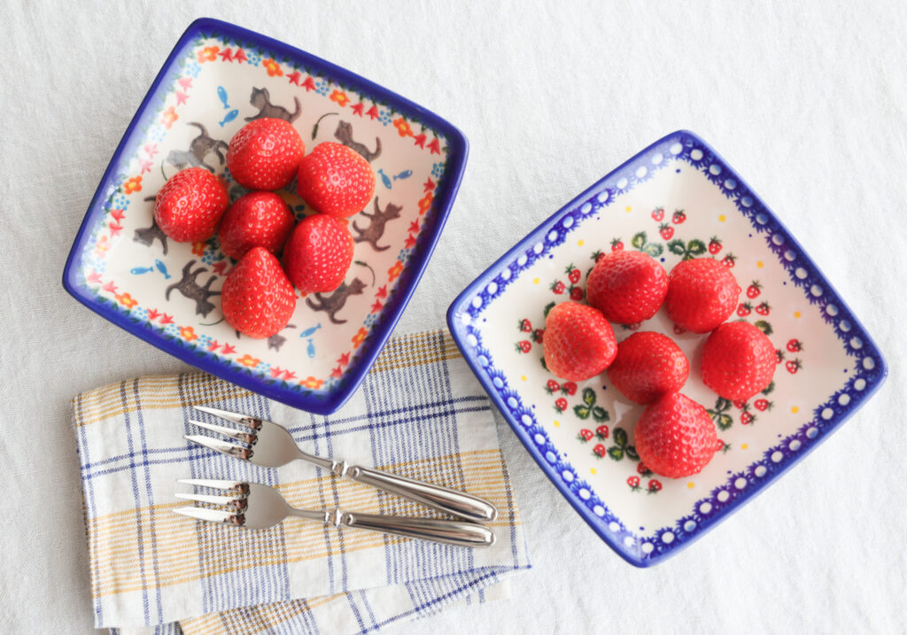 タフィーボウル・ミニも新しい柄を含めて入荷しました。スクエアなフォルムのボウルは料理を恰好良く盛り付けることができる優れものです。年末年始休みに鍋料理を食べた時のデザートはいちごでした。折角だから初登場のいちご柄のタフィーボウル・ミニに装いました。