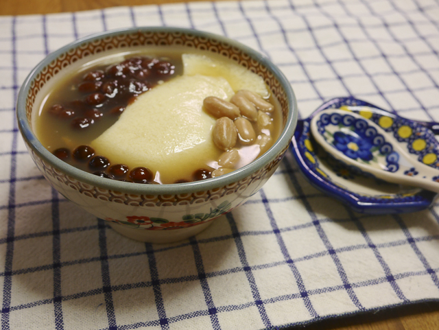 この日は黒蜜のシロップに、小豆と茹でたタピオカ、ピーナッツをトッピングしています。